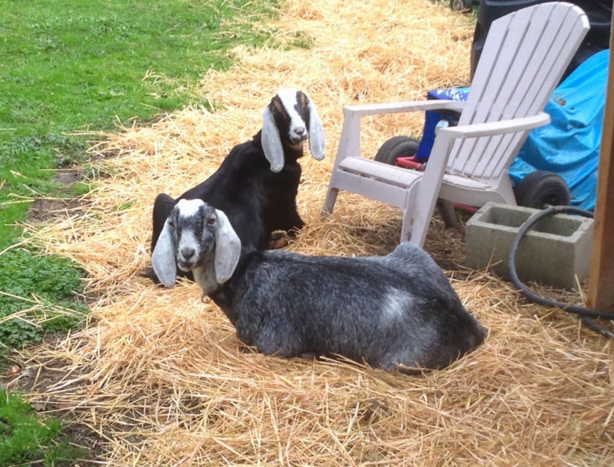 So here's the update on Big old Norman and his side kick Chewey. They have grown up and are now very powerful and when they stand on their hind legs they are taller than me. They have really turned out to be great kids. They are inseparable for sure, true brothers. We love them. Chewey has figured out how to climb the Apple tree, and Norman can open the gate unless we bolt it. Most people would call them live stock, but they are pets to us. I put a old baby picture up on this post to remember how small they were when they were babies. Weather there laying in the fire pit, climbing trees, play fighting, or rubbing their little mugs on you for some love, they are our kids here at the Jensen Bese camp with little goat in tow(the last chicken). .JPG)